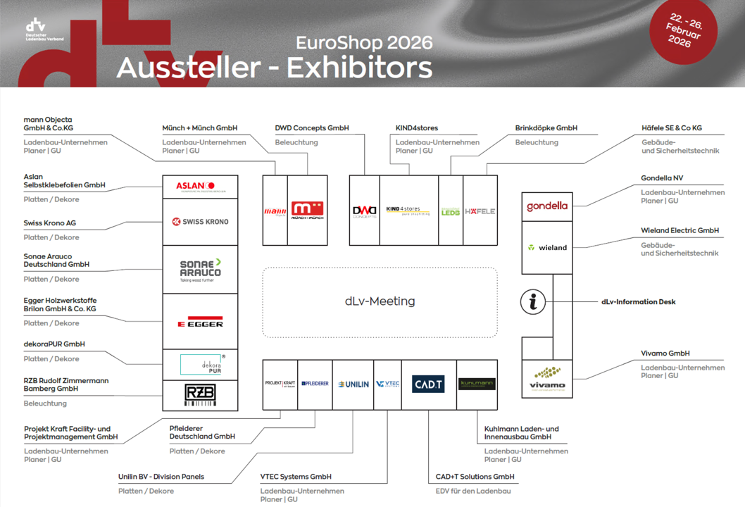 Der dLv tritt auf der EuroShop 2026 mit einem Gemeinschaftsstand auf. Auf über 1.200 qm stellt er mit insgesamt 21 Ausstellerfirmen das Netzwerk dar.
